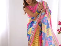 Graceful Yellow & Pink Multicolor chinon saree with vibrant digital prints, paired with a contrasting hot pink art silk blouse for a chic and modern ethnic look.