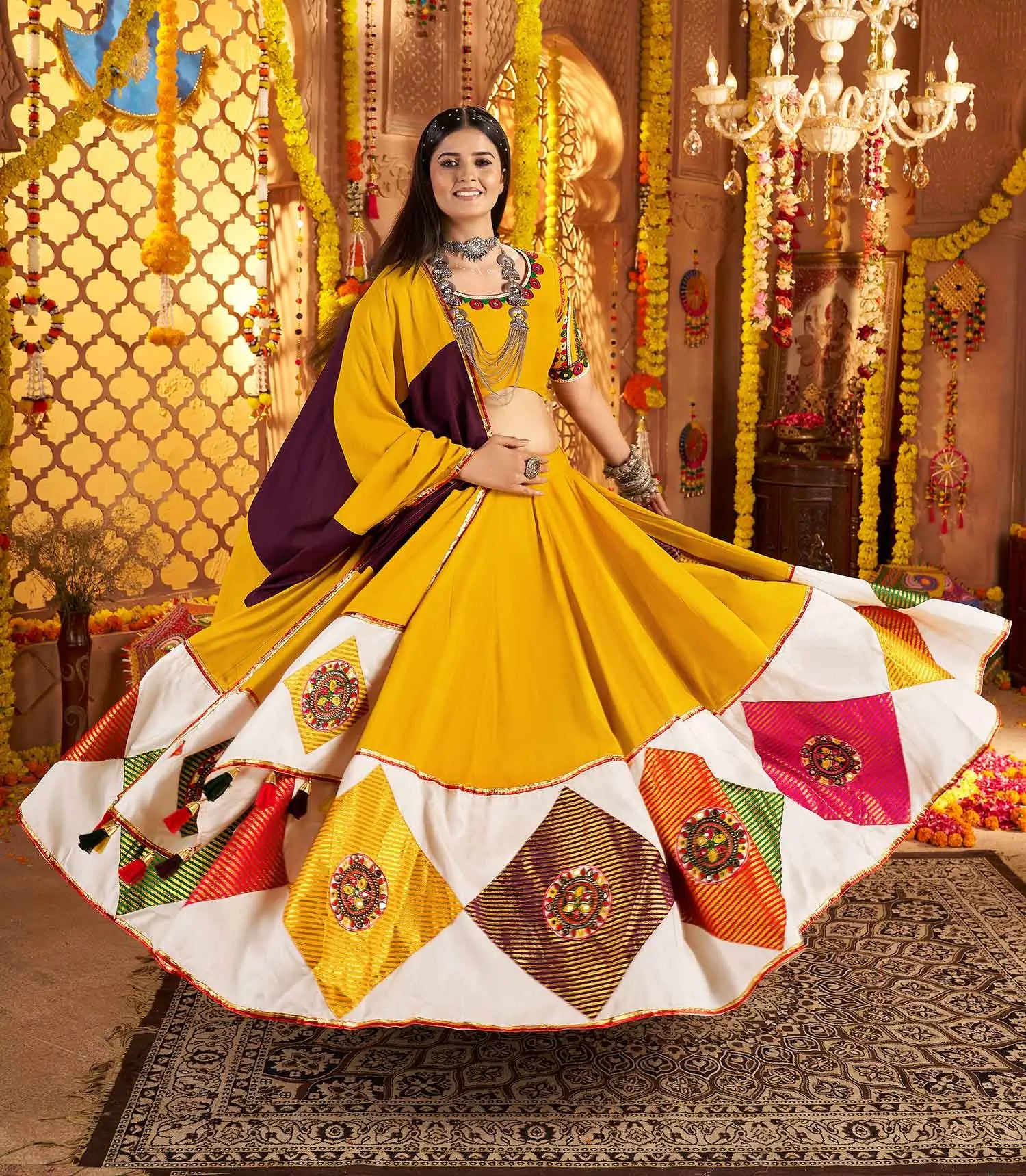 Yellow Navratri Lehenga With Embroidery & Colorful Jacquard Patch Work
