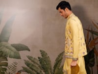 Yellow Wedding Wear Silk Kurta With Thread Sequins Embroidery Work Koti(Jacket)